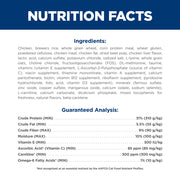 Ingredients: Chicken, Brewers Rice, Whole Grain Wheat, Corn Protein Meal, Wheat Gluten, Powdered Cellulose, Chicken Meal, Chicken Fat, Dried Beet Pulp, Chicken Liver Flavor, Lactic Acid, Calcium Sulfate, Potassium Chloride, Iodized Salt, L-Lysine, Whole Grain Oats, Choline Chloride, Fructooligosaccharides (FOS), DL-Methionine, Taurine, vitamins (Vitamin E Supplement, L-Ascorbyl-2-Polyphosphate (source of Vitamin C), Niacin Supplement, Thiamine Mononitrate, Vitamin A Supplement, Calcium Pantothenate, Biotin, Vitamin B12 Supplement, Riboflavin Supplement, Pyridoxine Hydrochloride, Folic Acid, Vitamin D3 Supplement), minerals (Ferrous Sulfate, Zinc Oxide, Copper Sulfate, Manganous Oxide, Calcium Iodate, Sodium Selenite), L-Carnitine, Calcium Carbonate, Dicalcium Phosphate, Mixed Tocopherols for freshness, Natural Flavors, Beta-Carotene.