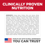 Ingredients: Chicken Broth, Chicken, Pork Liver, Carrots, Wheat Gluten, Rice Starch, Spinach, Rice, Chicken Fat, Natural Flavor, Calcium Chloride, Potassium Alginate, Ground Pecan Shells, Monosodium Phosphate, Dicalcium Phosphate, Flaxseed, Dried Beet Pulp, Calcium Lactate, Calcium Gluconate, Powdered Cellulose, Dried Citrus Pulp, Guar Gum, Fish Oil, Fructooligosaccharides (FOS), Choline Chloride, Potassium Citrate, Taurine, Pressed Cranberries, vitamins (Vitamin E Supplement, Ascorbic Acid (source of Vitamin C), L-Ascorbyl-2-Polyphosphate (source of Vitamin C), Niacin Supplement, Thiamine Mononitrate, Vitamin A Supplement, Calcium Pantothenate, Vitamin B12 Supplement, Pyridoxine Hydrochloride, Riboflavin Supplement, Menadione Sodium Bisulfite Complex (source of Vitamin K), Biotin, Folic Acid, Vitamin D3 Supplement), Oat Fibre, Sodium Tripolyphosphate, Magnesium Oxide, minerals (Zinc Oxide, Ferrous Sulfate, Copper Sulfate, Manganese Sulfate, Manganous Oxide, Calcium Iodate, Sodium Selenite), Thiamine Hydrochloride, Beta-Carotene.