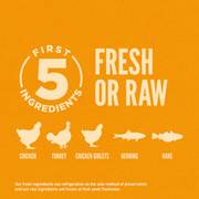 2/3 of ORIJEN's meat is FRESH (refrigerated, without preservatives) or RAW (flash-frozen, without preservatives), including the top 10 ingredients.