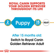 Once your Golden puppy is over 15 months old, transition him from puppy dog food to Royal Canin Golden Retriever Adult dog food for precise nutrition into the adult years.
